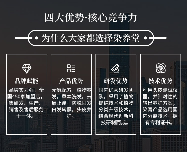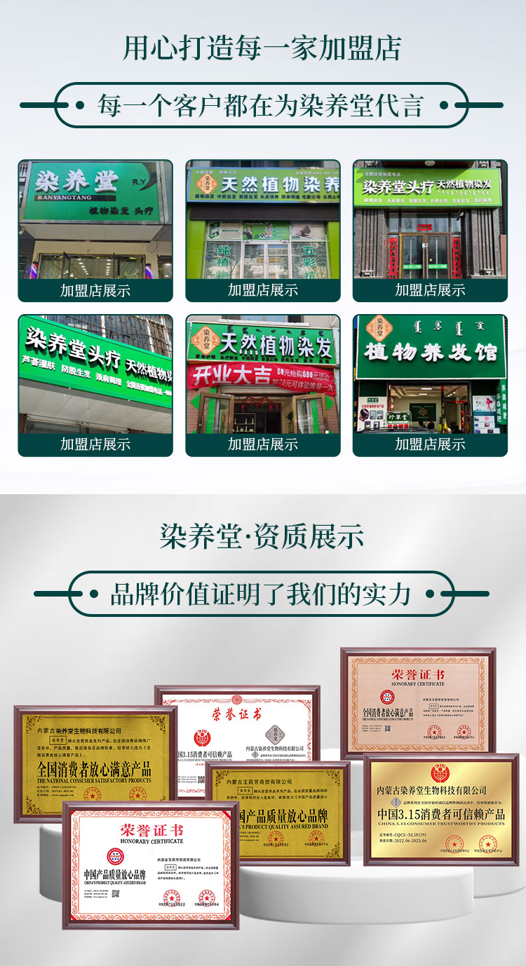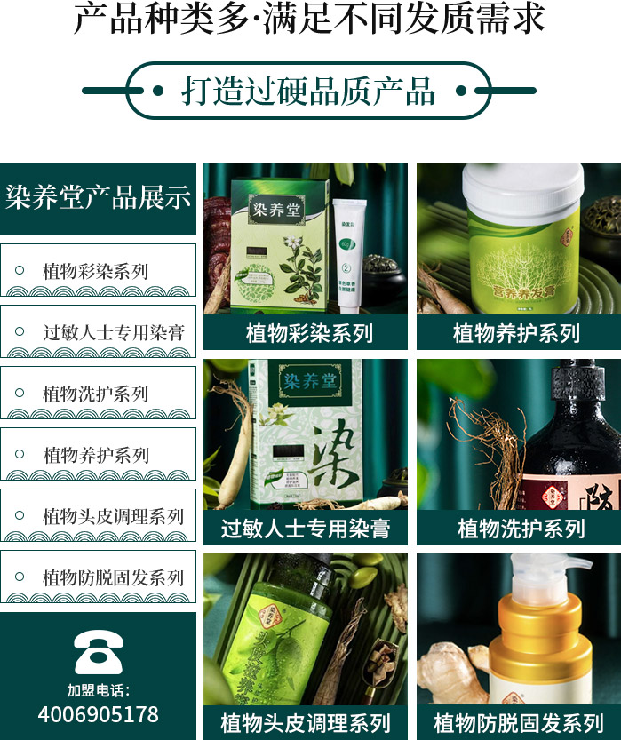 染养堂品牌创立于2006年,经10年产品研发升级和经营模式打造,于2016年成立染养堂生物科技有限公司,2017年注册染养堂商标。后展开6年门店运营和推广,现全国拥有门店450家,已经成为了产品研发,包装生产,销售推广,教育培训,加盟运营为一体的综合性企业。“天然、绿色、健康”是我们的品牌理念。采用“天然植物+中药配方”的产品生产标准和“植物产品+中医按摩”的养护理念,倡导绿色健康的染发、护发,养发...